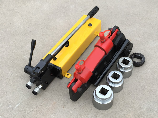 手動高壓泵由操縱手柄,高壓泵、換向閥、油箱、壓力表和帶快速接頭的輸油管等組成。帶棘輪式液壓扳手由高壓油口、液壓油缸、曲柄、反力桿、棘輪裝置、套筒等組成、前者系動力源部件,后者為扭矩執(zhí)行機(jī)構(gòu)。